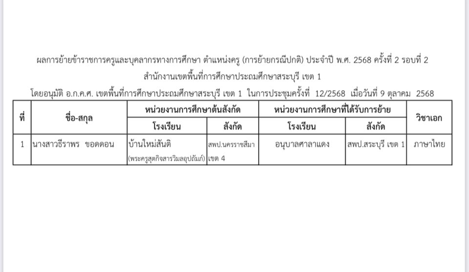 อ.ก.ค.ศ.เขตพื้นที่การศึกษาประถมศึกษาสระบุรี เขต 1 ในคราวประชุมครั้งที่ 11/2568 วันที่ 19 กันยายน 2568 มีมติอนุมัติย้ายผู้บริหารสถานศึกษา (กรณีปกติ) ประจำปี พ.ศ. 2568 แทนตำแหน่งว่าง จำนวน 4 รายอ่านต่อ